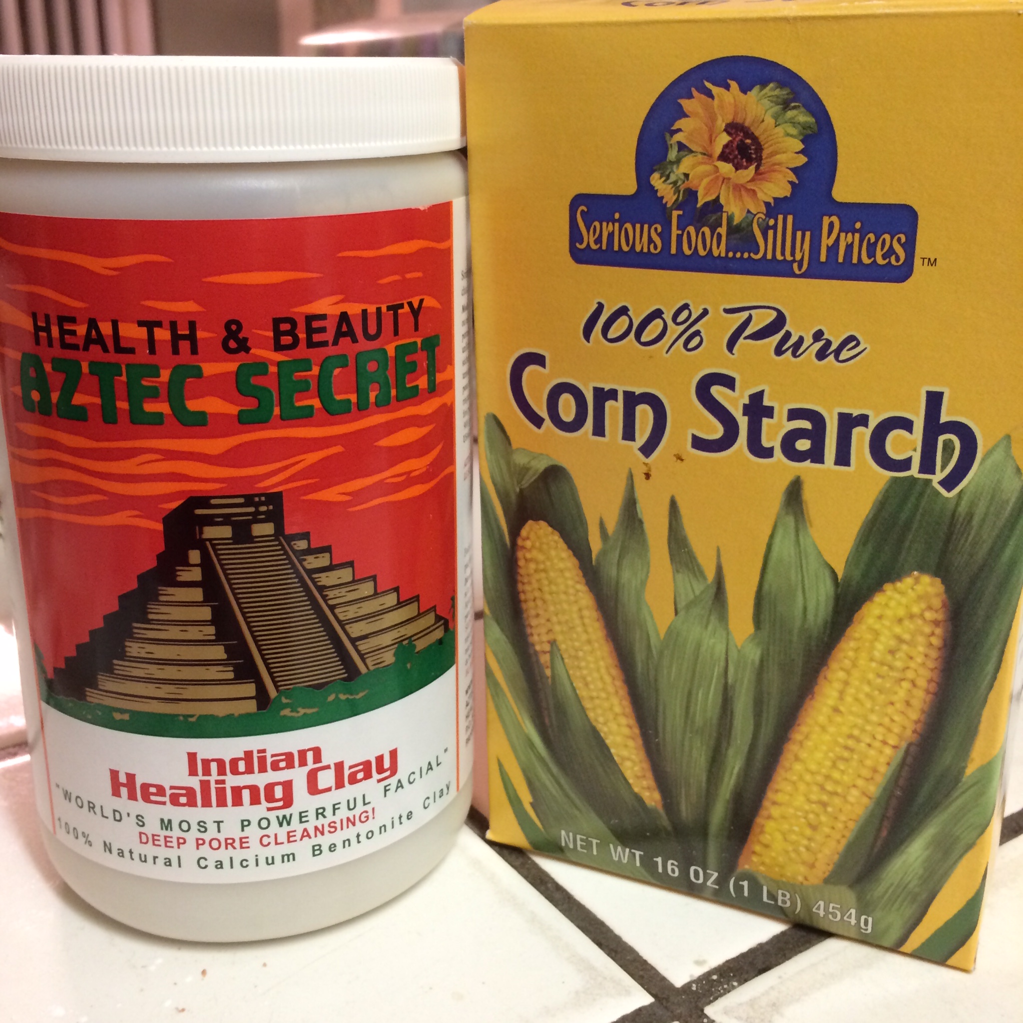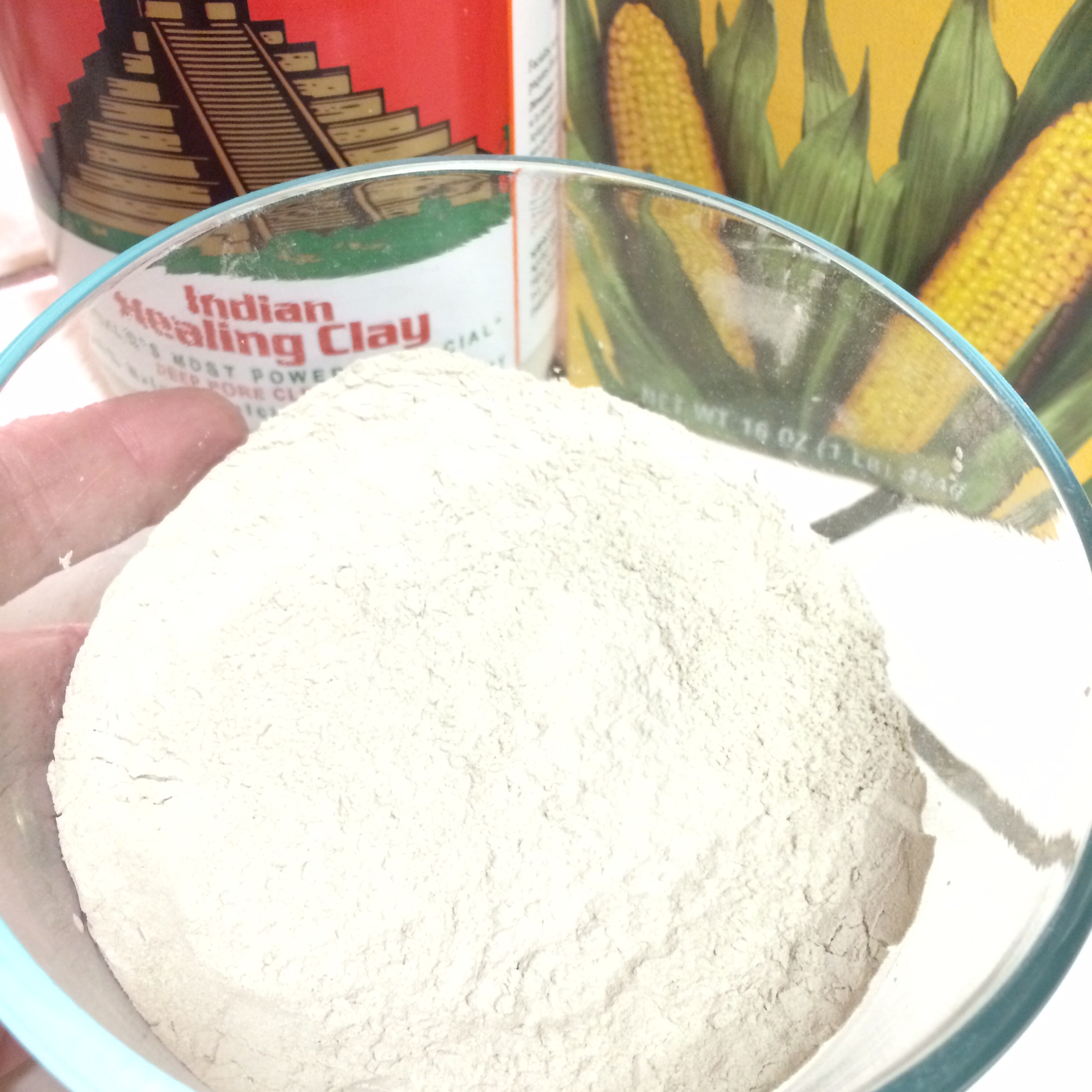 The two main ingredients are cornstarch and French green clay. (I bought both at a store called Sprouts. The clay was a bit spendy, but you use so little that it will last for several projects). An optional ingredient is baking cocoa to add color, but I chose to avoid that because I wasn’t comfortable powdering my face with chocolate. Instead I took the remaining bits of my powder and ground it into the mixture of cornstarch and clay. I use a very