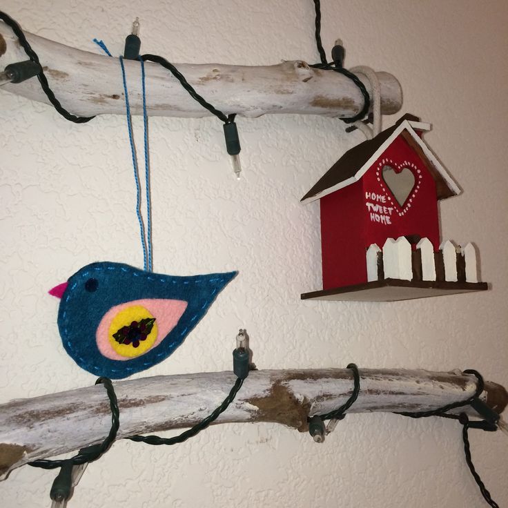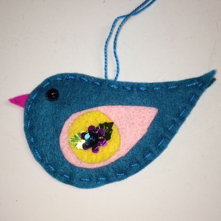Blue was made out of various colors of felt. The decoration on her wing is made from sequins and her eye is a black bead. She was stitched together with embroidery floss.