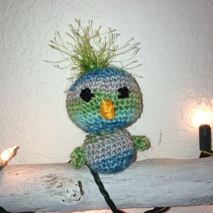 Norville is crocheted using Serenity Sock Weight yarn. I found the pattern on Ravelry and made some of my own adjustments. I used embroidery floss for his eyes and beak and added fun fur yarn for the feathers on his head.