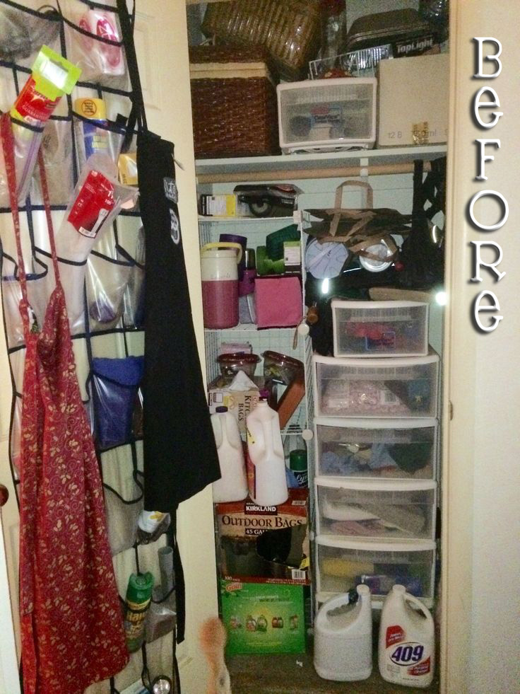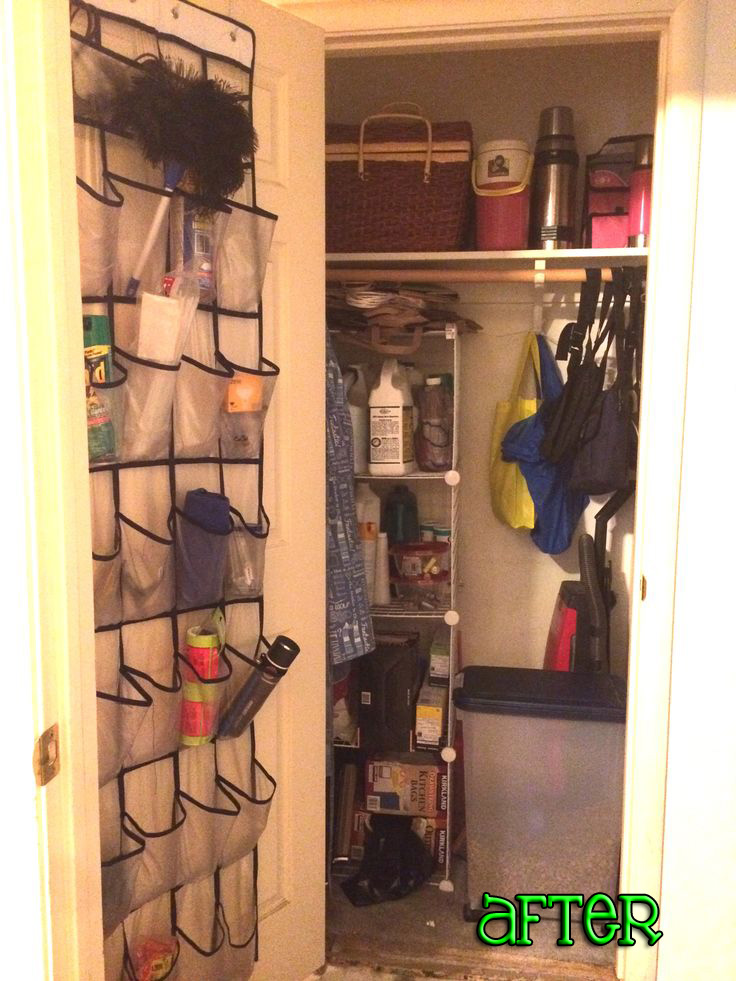 Hall Closet After5Hall Closet After11Hall Closet After10Hall Closet After9Hall Closet After4Hall Closet After6Hall Closet After2Hall Closet AfterHall Closet After3Originally I had our cleaners on the bottom shelf, but I moved them up to the top to get them away from the dog food.