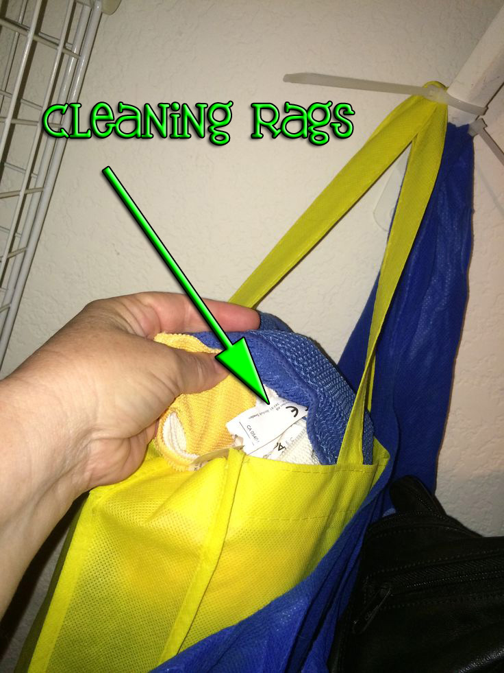 We keep our fanny packs and travel bags in here by looping them around the closet rod.  Makes it super easy when we need them for a long walk or for a trip.