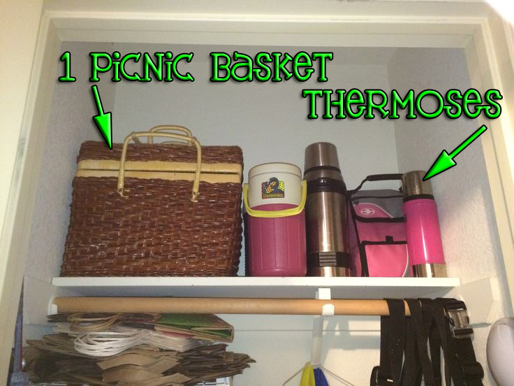 And finally, I stored our picnic basket, water coolers and thermoses on the top shelf as well as decluttered our multi-pocket over-the-door organizer.  I Goodwill-ed a bunch of stuff (fairly certain I won’t need a set of Dora-the-Explorer dominos), threw out a few things and am feeling really good about this FINISHED project.