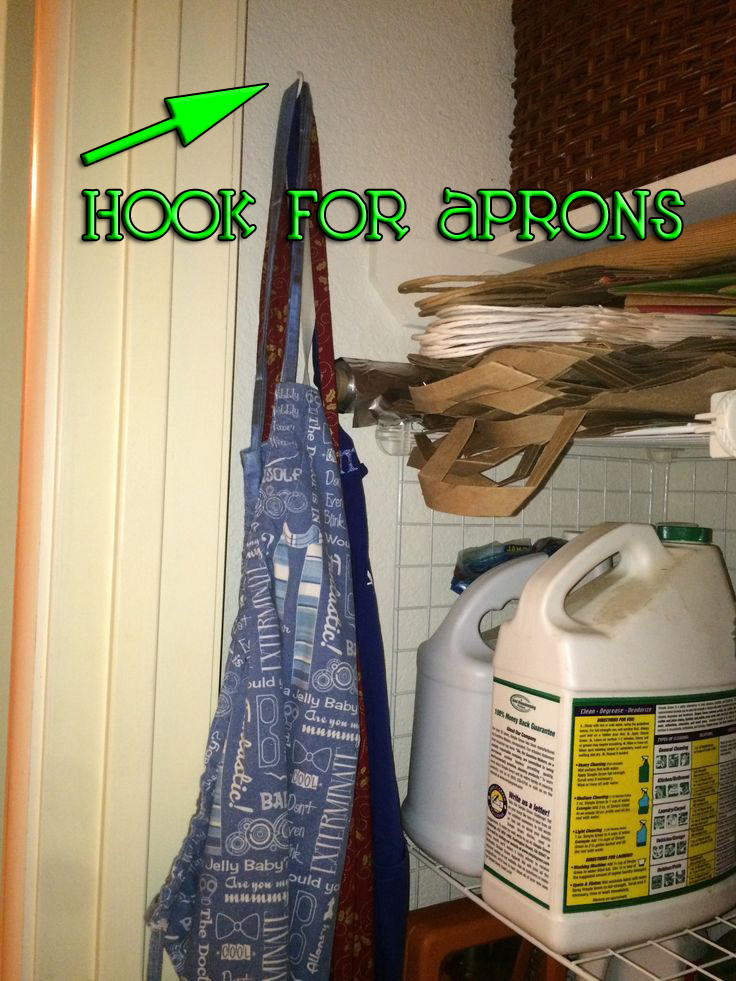 I installed a hook on the left wall just inside the door for our aprons as well as a Tap light on the right side wall just inside the door.