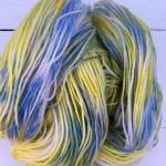 This skein (right) was a combination of pre-mixed Lime Kool Aid and pre-mixed Wilton Violet food color paste. This was also heat set with steam.